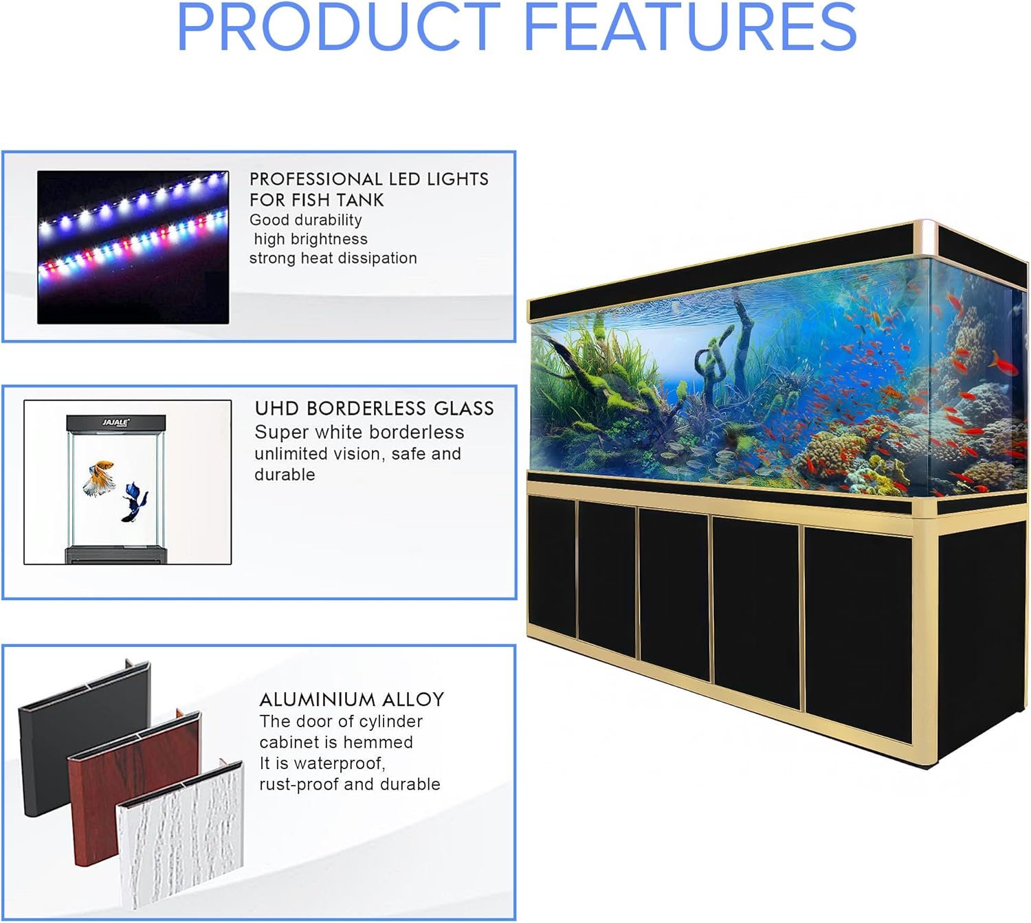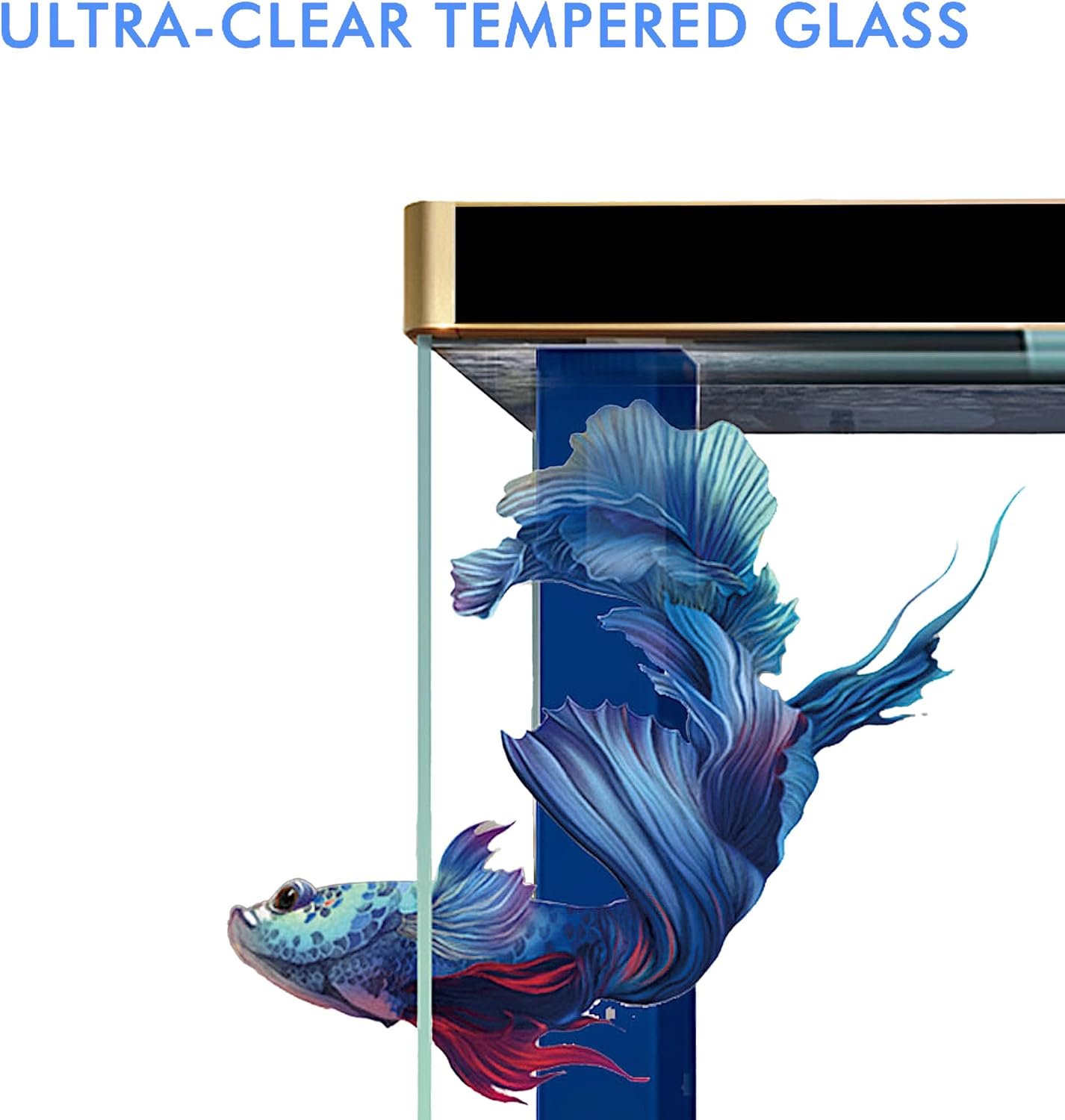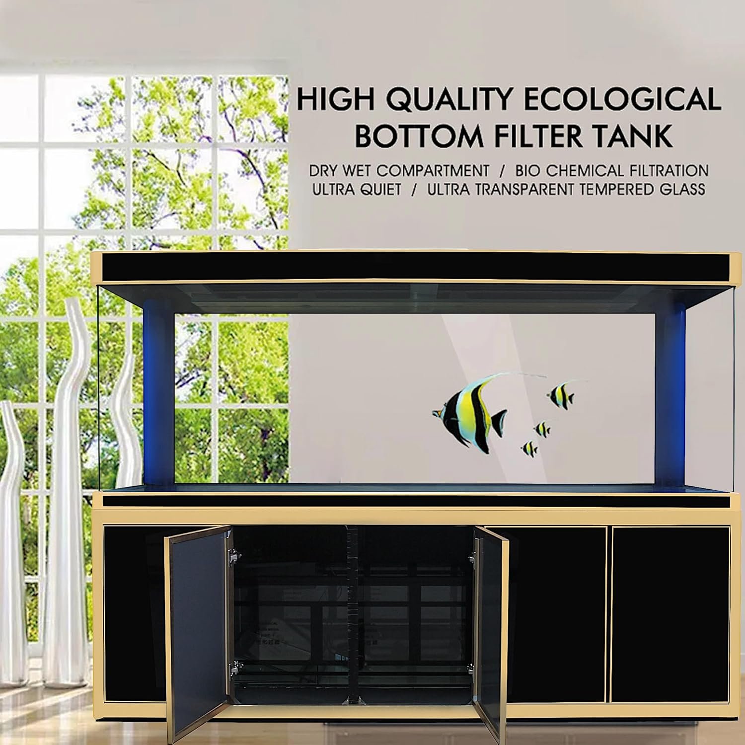 - Elegant Design: The style, featuring Black with Gold Trim, showcases a modern design aesthetics. The clear glass allows for a stunning view of aquatic plants and fish, providing a captivating and immersive experience. The luxurious design ensures a sophisticated home for your aquatic pets. Product weight: 957 lbs.