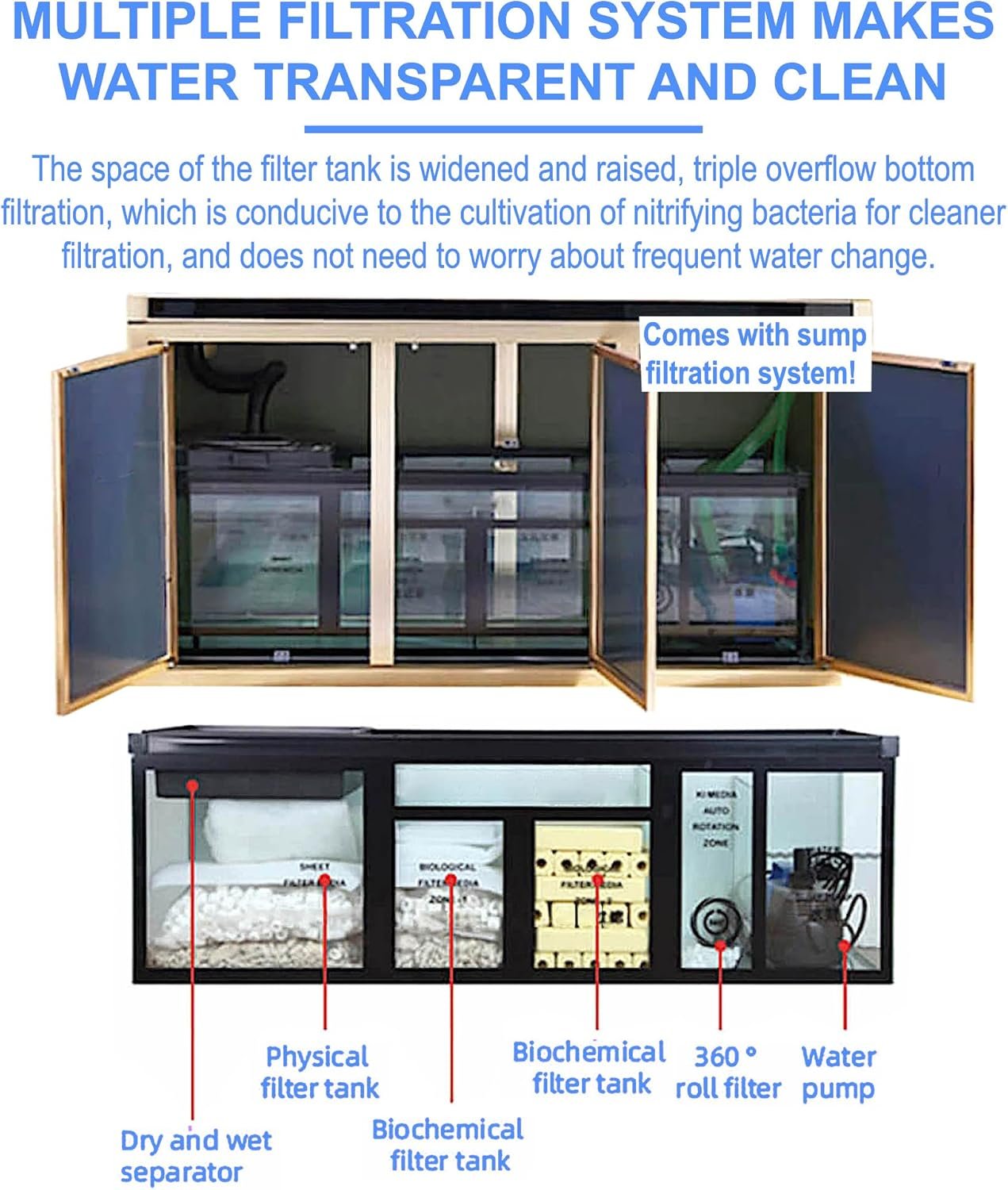 - Complete Setup: The bundle includes a cabinet, a 75W 2000 GPH water pump, and a filtration system with filter media. The aluminum frame dimensions are 91 (L) x 26.7 (W) x 30 (H) inches. This frame is designed to resist tension and torque from heavy loads, is corrosion-resistant, and is easy to clean and maintain, ensuring long-term water clarity. Corrosion-resistant, easy to clean and maintain. Can keep the water clean for a long time.